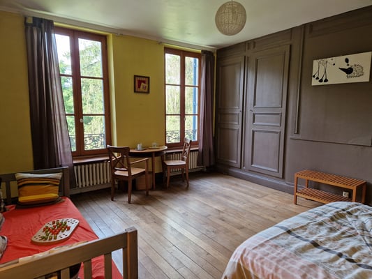 La vaste (25m²) chambre d'hôtes dans les tons pamplemousse et marron glacé est meublée d'un grand lit double (160).